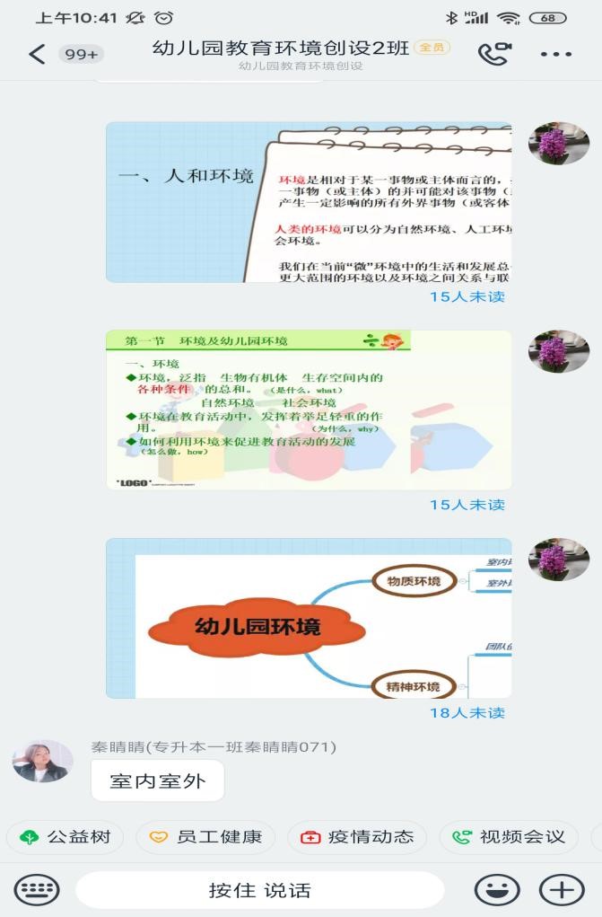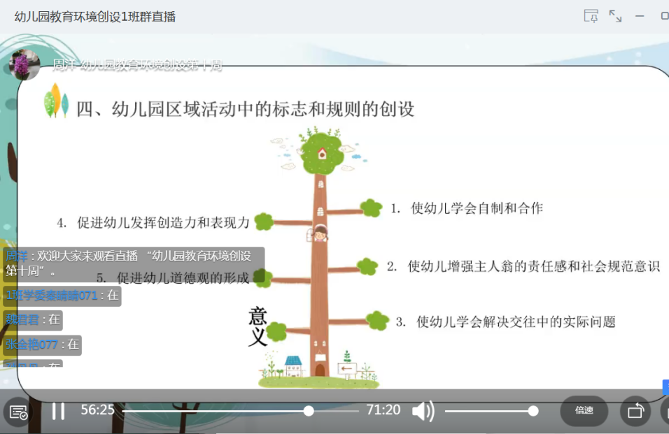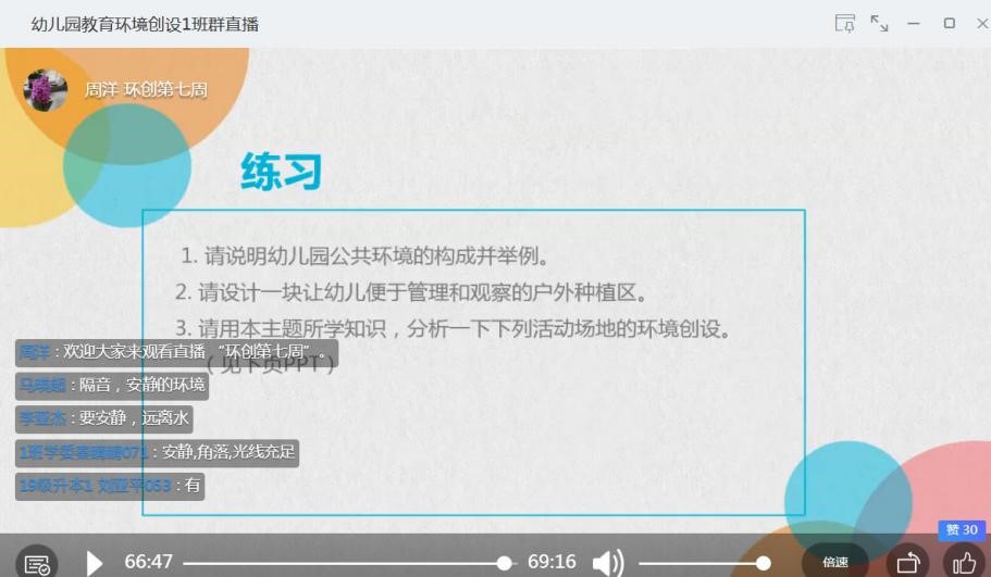 学生做了预习和观看课程课件及电子教材,在直播中,我会增添更多案例结合课程内容详细讲述每节课内容,同时会结合案例提问问题让学生回答,每节课都会给学生布置相关作业(幼儿园设计图或思考题作业)