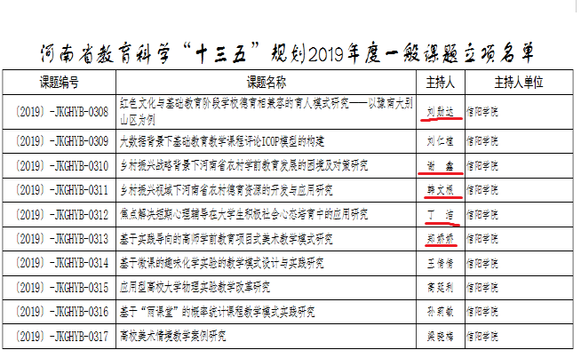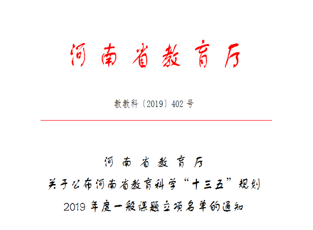 近日,河南省教育厅下发了《关于公布河南省教育科学“十三五”规划2019年度一般课题立项名单的通知》(教教科〔2019〕402号),根据《河南省教育厅关于河南省教育科学“十三五”规划2019年度一般课题申报工作的通知》(教教科〔2019〕79号)要求,经专家评审、省教育科学规划领导小组审核,确定河南省教育科学“十三五”规划2019年度一般课题立项名单,我校申报的10项课题获批立项,其中教育学院获批5项。望课题负责人积极开展课题研究,按时结项,现将有关事项通知如下: