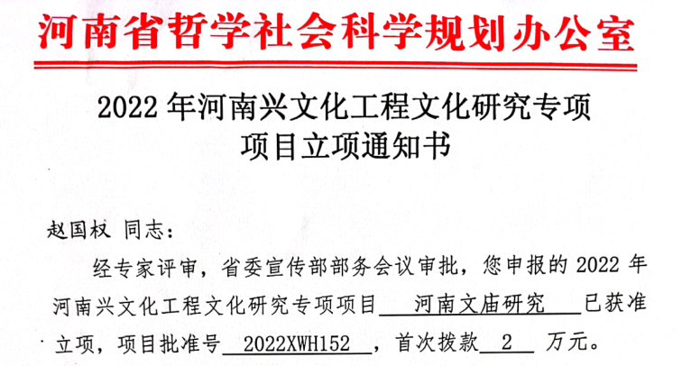据河南省哲学社会科学规划办公室《2022年河南兴文化工程文化研究专项项目立项通知书》,由我院特聘教授、中国庙学研究中心主任赵国权教授申报的“河南文庙研究”获得立项,项目批准号是“2022XWH152”。这是继刚刚结项的“河南历代文庙史料整理与研究”之后获批的又一项关于河南文庙方面的省社科项目,将区域文庙暨庙学研究向前推进了一大步,日益形成我院文庙暨庙学研究特色。