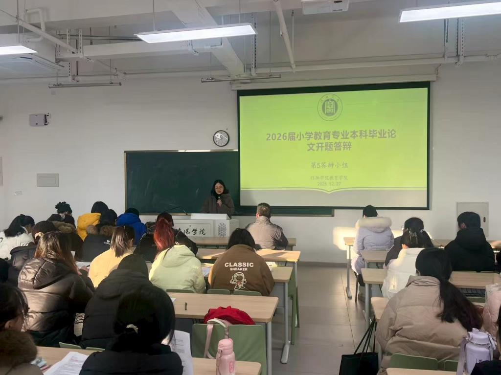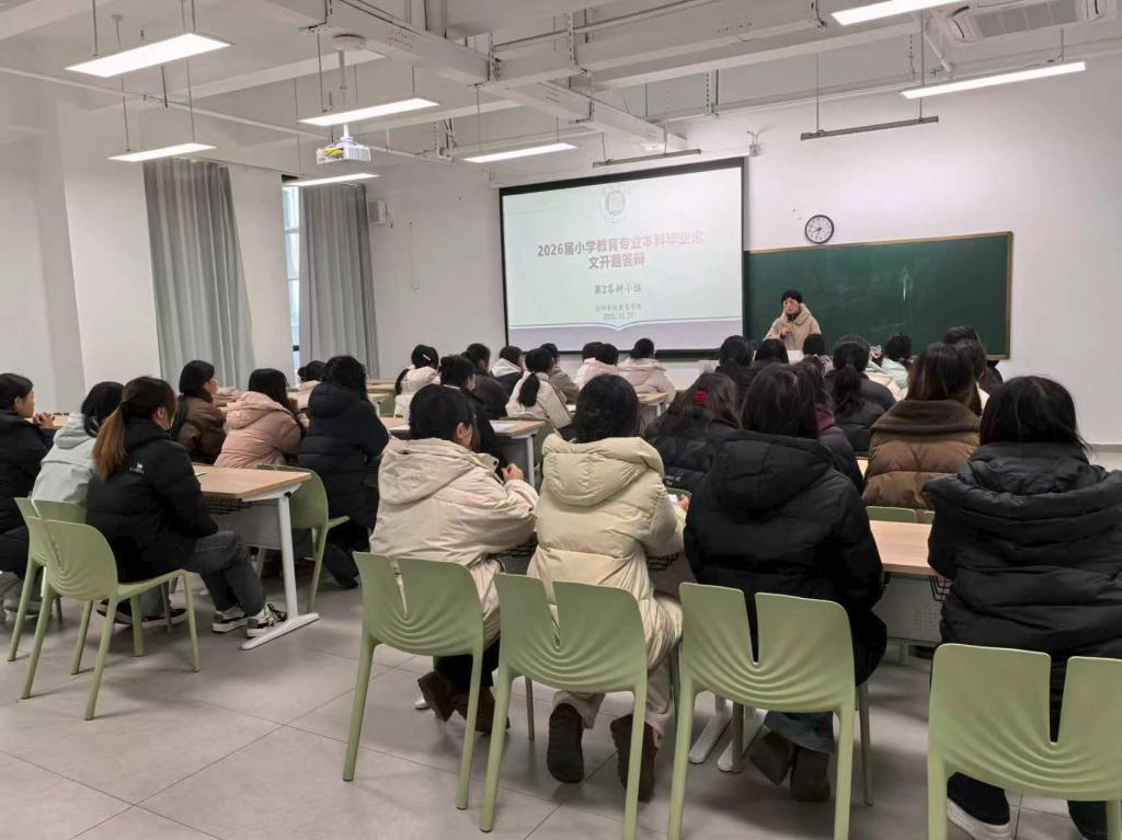 为扎实推进2026届本科人才培养工作,把好毕业论文质量“第一关”,12月27日,依据先前制定的《2026届小学教育专业本科毕业论文开题工作方案》,小学教育专业分别在教三楼307、312、412、413、424和425教室展开了2026届本科生毕业论文开题报告会。从选题打磨到思路梳理,师生齐聚一堂,用严谨又热烈的交流,为即将开启的论文写作之旅筑牢基础。