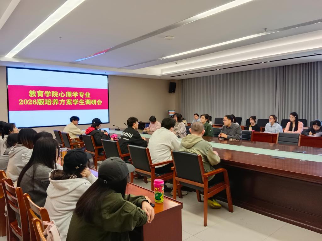 为优化心理学专业人才培养体系,4月10日下午,教育学院召开2026版心理学专业培养方案学生调研会。教育学院教学副院长段海丹、心理学专业负责人刘丽红、心理学教研室主任杨立昊、教师代表李夏菲出席,与大一到大四年级学生代表深入交流。