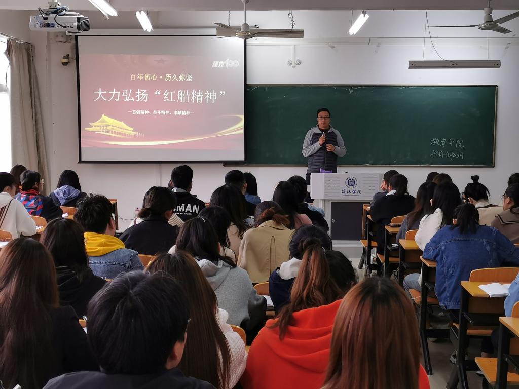 为迎接建党100周年,弘扬“红船精神”,坚定“不忘初心、坚定不移跟党走”的信念。4月25日下午,教育学院党总支书记张甲楠在社科楼315为发展对象们做了题为“ 大力弘扬‘红船精神’”的专题党课。