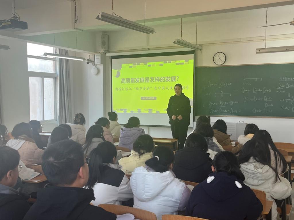 课上,付珺老师带领同学们回顾了徐汇滨江十年蜕变的故事,在城市漫游中感受中国式现代化美好图景。付珺老师强调,新时代新征程中,以中国式现代化全面推进中华民族伟大复兴的宏伟画卷已经徐徐展开,而青年作为推进中国式现代化的重要力量,应当珍惜如今的太平盛世,踔厉奋发,脚踏实地,从身边小事做起,用自己的实际行动,为祖国展现青春的力量和责任感。