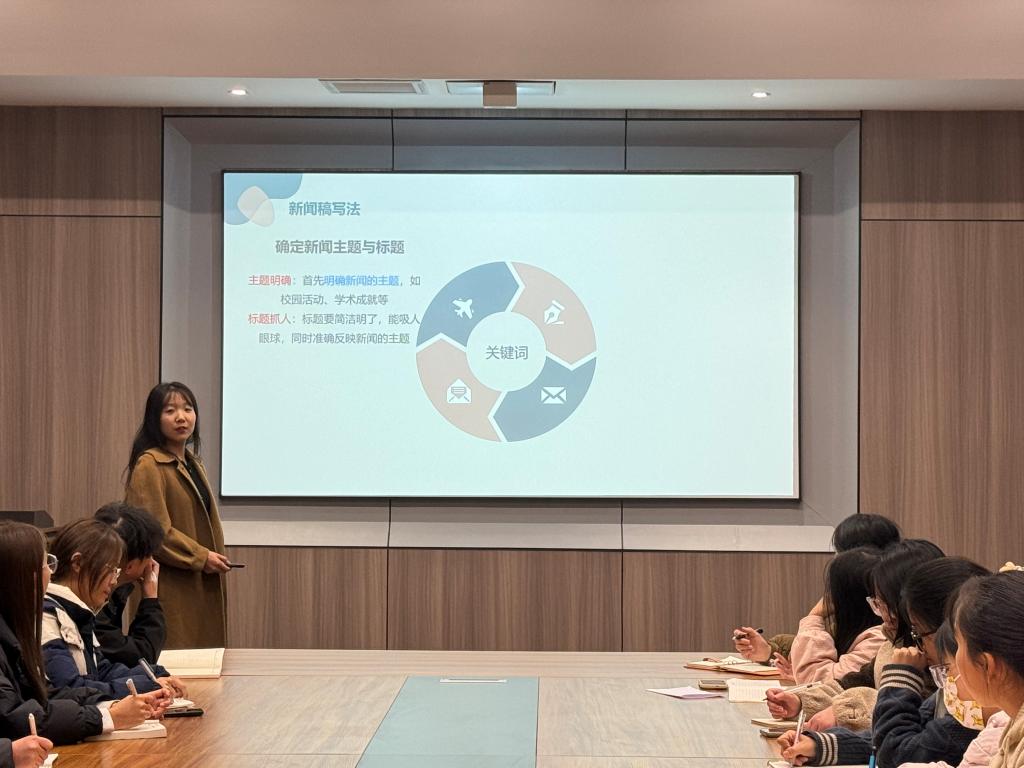 在素养培训方面,融媒体中心负责人贾诗雨以“新闻宣传技能培训”为主题,凭借丰富的实践经验,深入讲解了如何撰写新闻,包括精准确定主题与标题、巧妙撰写导语、全面展开新闻主题以及恰到好处地进行总结等关键步骤。同时,她详细阐述了新闻稿的格式要求和行文规范,以确保新闻写作的规范性与客观性。通过新闻宣传技能的培训,旨在提高学生干部的新闻写作能力,更好地做好面向青年大学生的宣传工作。