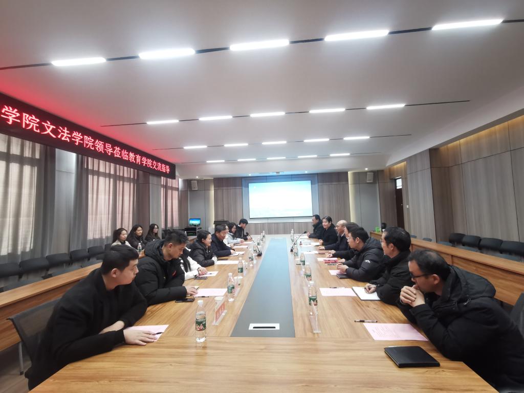 名誉院长致欢迎词,他代表教育学院对闫江涛院长一行的到来表示热烈的欢迎,并介绍了我院在师资队伍、专业建设、科学研究、学生就业以及党建工作所取得的成果。他说,郑州工商学院文法学院发展势头强劲,十分重视高质量应用型人才的培养。目前,我院正在积极探索数智赋能师范生职前素养培养,以及如何更好的将数智技术融入教育的各个环节,接下来,愿和文法学院进行更深入的交流。