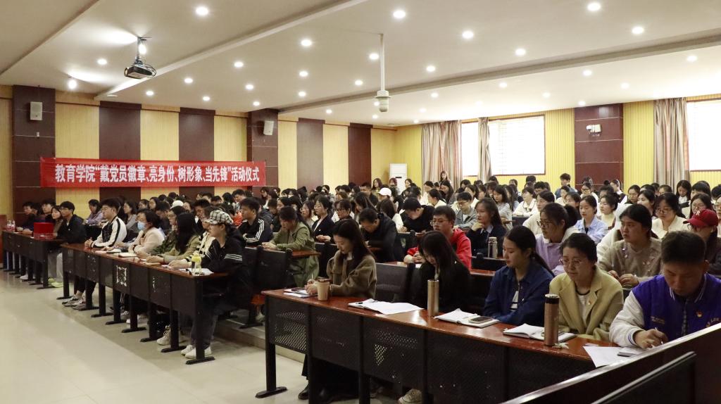 为充分发挥基层党组织战斗堡垒作用和党员先锋模范作用,教育引导广大党员始终牢记党员身份,教育学院党总支于4月9日在图书馆102教室开展了“戴党员徽章、亮身份、树形象、当先锋”活动启动仪式。学院党总支书记张甲楠,党总支纪检委员、教学副院长段海丹,党总支宣传委员白鹭,党总支统战委员郝昊和全体师生党员参加了此次活动。活动启动仪式由郝昊主持。