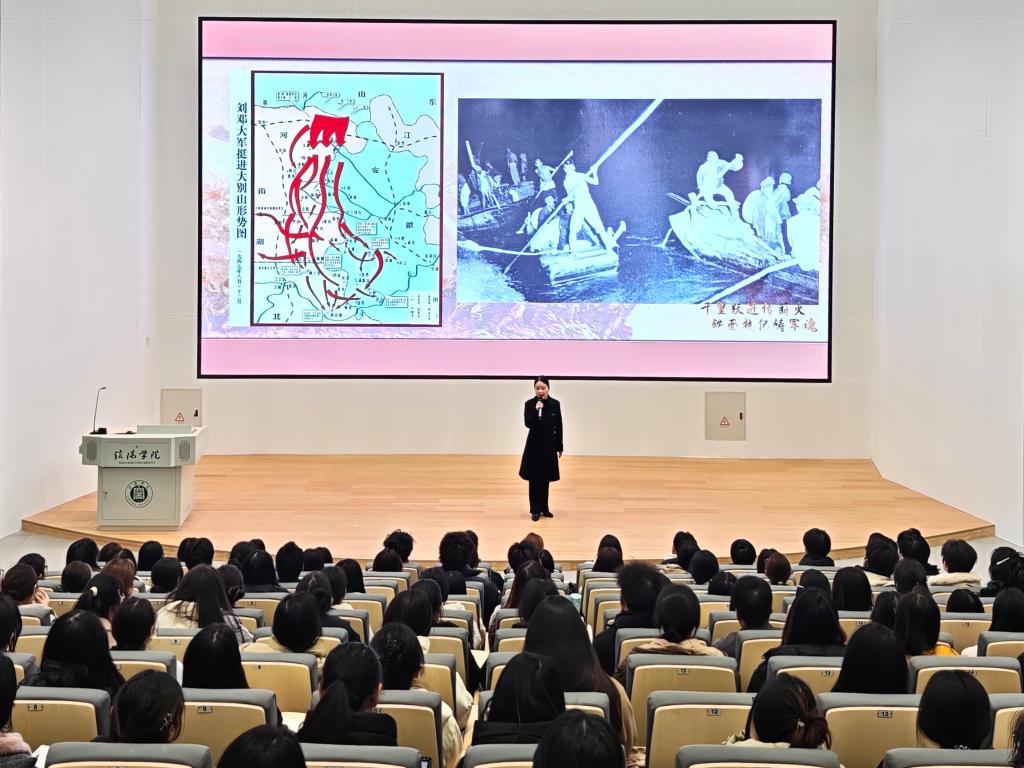 此次主题党课以音乐和影像资料为背景,由讲解员老师讲台讲述为主要形式。内容包括《千里跃进传薪火铁面执纪铸军魂》《海棠绽放纸短情长》和《永远的丰碑》三个篇章,分别讲述刘邓大军“约法三章从严治军”、周恩来与邓颖超两位革命家之间感人至深的同志情、战友情和伴侣情以及平均年龄只有16岁的光山匡氏八兄弟当红军的故事。每一个故事都仿佛将师生们带回了那段波澜壮阔的峥嵘岁月。老师们时而激昂高亢,讲述着革命先烈不畏牺牲、前仆后继的英雄气概;时而语重心长,引导师生们感悟信仰的力量与初心的纯粹。不仅让师生们对党的历史有了更深刻的理解,更在心中点燃了传承红色精神、担当时代使命的熊熊火焰,让大家深受触动、备受鼓舞。