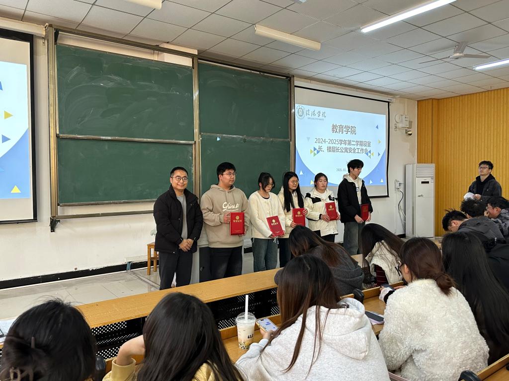会议伊始,樊雪冰宣读了《教育学院2024-2025学年第一学期优秀楼层长、寝室长表彰决定》,对在宿舍管理中表现优异、积极履行职责的同学给予肯定,并鼓励大家继续发挥榜样引领作用。随后,他宣读了《教育学院对2024-2025学年第二学期楼层长、寝室长聘任决定》,明确新学期宿舍管理队伍的成员名单,为后续工作奠定基础。学工干事胡超为获奖的优秀楼层长、寝室长颁奖,现场气氛热烈,掌声不断。
