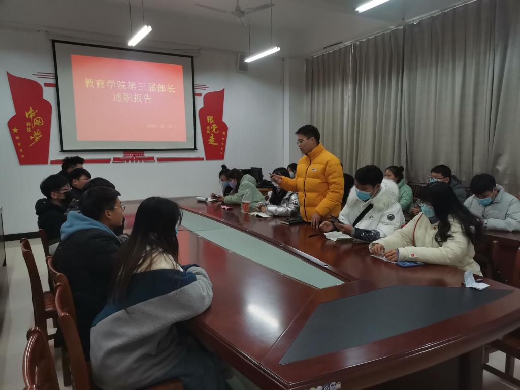 为了对本学期的学生会工作进行总结,教育学院于12月30日在社科107教室开展了学生干部述职大会,学生会主席团以及学生会部长全体成员参加了此次会议。