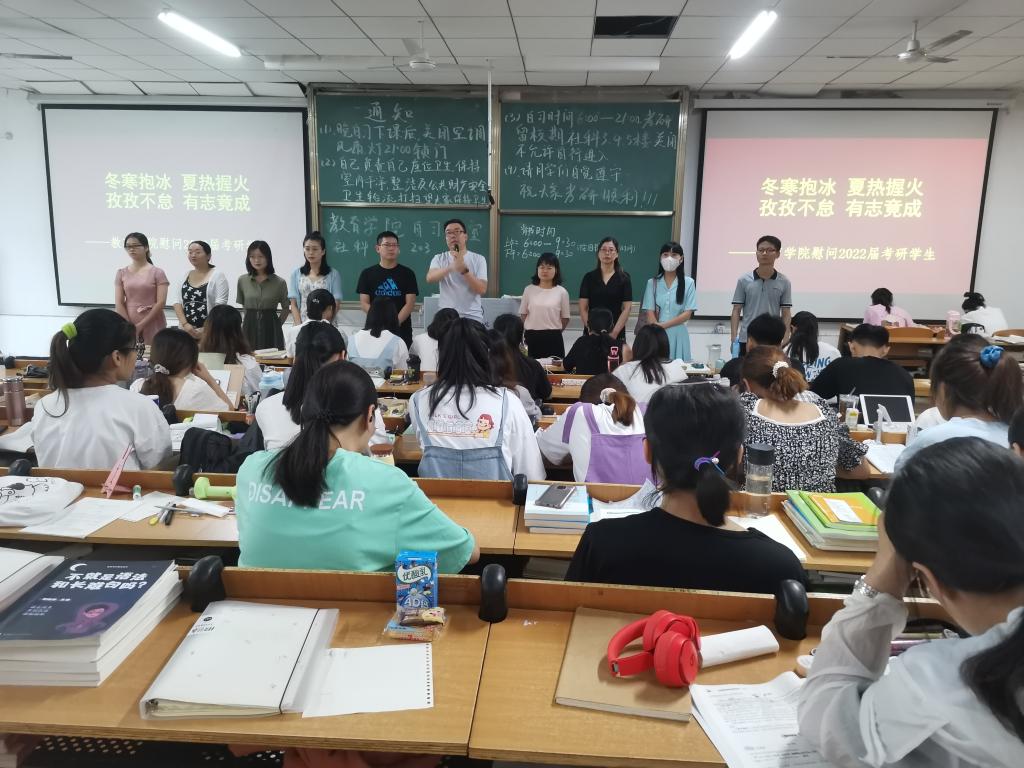 夏日炎炎,为进一步了解暑期留校考研学生备战学习情况,鼓励考研同学继续奋战,7月29日上午,教育学院组织了2022届考研学生慰问活动,学院党总支书记张甲楠、教学副院长郑娇娇、学工干事郝昊、全体辅导员前往考研自习室慰问正在辛苦备战的考研学子们。