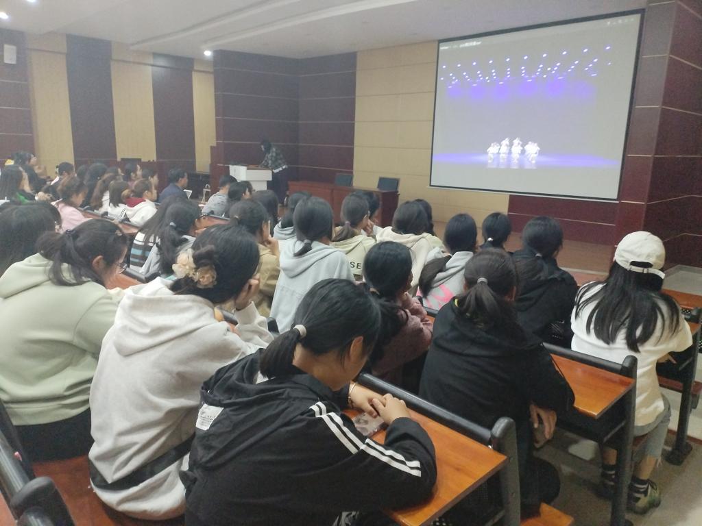 专业教育活动三:由艺术教研室主任王思老师说明学前艺术课程的特点并展示学前艺术课程的教学成果。为了使新生更加熟悉学前教育专业艺术类课程的特点,王思老师以课堂教学视频为例,逐一介绍了美术类课程、舞蹈类课程、音乐类课程、琴法课程的学习目标和要求,意在打消新生无基础学习艺术类课程的顾虑,坚定学好学前技能的信心。之后,王思老师向学生展示了往届学前教育艺术节中的优秀作品录像。