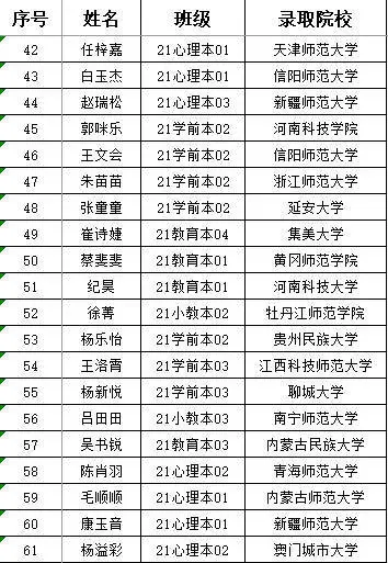 近日,2025年全国硕士研究生招生录取工作落下帷幕,教育学院2025届本科毕业生考研成绩实现稳步增长。2025届本科毕业生中,61人成功考取研究生,与去年相比,实现稳步增长。尤其是心理学专业,较去年提升7%。其中,1人被211院校录取,5人进入双一流院校深造,录取院校包括华南师范大学、河南大学等知名高校,专业覆盖学科教学、小学教育、心理学等领域,体现了学院人才培养的多元方向与学科专业建设成效。