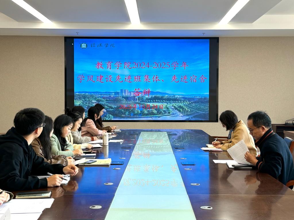 为深入贯彻落实立德树人根本任务,扎实推进学风建设,营造积极向上、勤奋好学的校园氛围,教育学院于10月24日在教三楼521会议室成功举办2024-2025学年学风先进班集体与先进宿舍答辩活动。经前期报名与筛选,共有15个优秀集体进入最终答辩环节,其中包括3个学风先进班集体候选班级和12个学风先进宿舍候选宿舍。