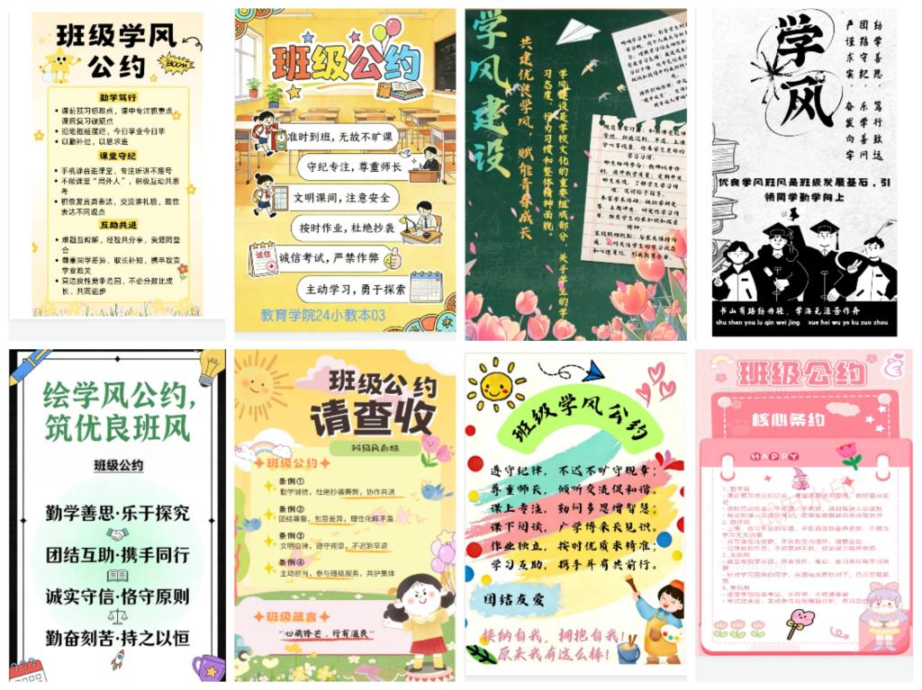 为深入强化班级学风建设,营造积极向上、互助共进的学习氛围,我院策划并启动了以“绘学风公约,筑优良班风”为主题的班级公约海报设计大赛。学风是班级建设的灵魂,关系到每位同学的成长与发展。面对当前部分同学存在的学习动力有待提升、纪律意识需进一步强化等现实情况,本次活动旨在突破传统说教模式,创新育人载体。大赛鼓励各班级围绕“勤学、笃行、守纪、互助”等核心内涵,将抽象的学风要求转化为生动直观、富有感染力的视觉艺术。此次海报设计大赛不仅是一次艺术展示,更是一场生动的自我教育与实践,它引导同学们从“被动接受规则”转向“主动定义氛围”,在创作中凝聚共识,在参与中践行承诺,从而有效推动公约内容落地生根,为打造学风扎实、班风优良的先进集体注入鲜活而持久的文化动力。