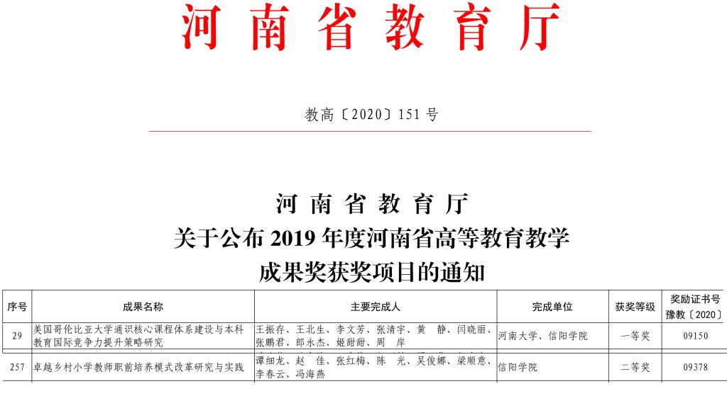 近日,河南省教育厅下发了《关于公布2019年度河南省高等教育教学成果奖获奖项目的通知》(教高〔2020〕151号),我院教师谭细龙主持申报的《卓越乡村小学教师职前培养模式改革研究与实践》项目荣获河南省高等教育教学二等奖。