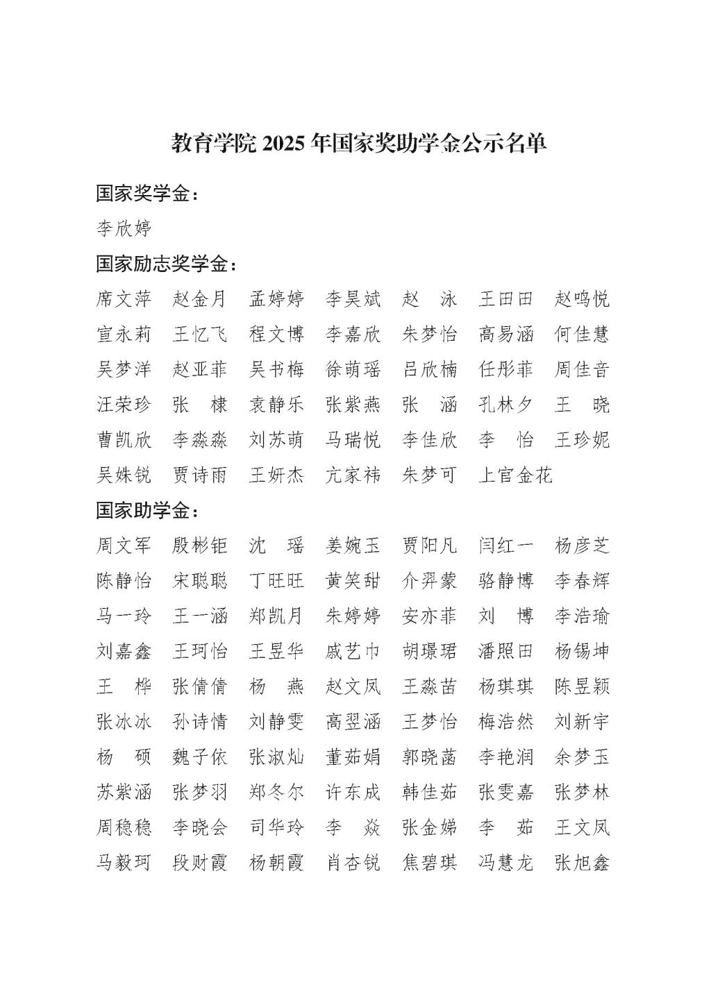 根据《信阳学院关于做好2025年国家奖助学金评审发放工作的通知》(校学字〔2025〕37号)文件要求,本着公平、公正、公开的原则,经过学生申请、班级综合测评、学院审核等程序,确定了教育学院2025年国家奖助学金名单,现予以公示。