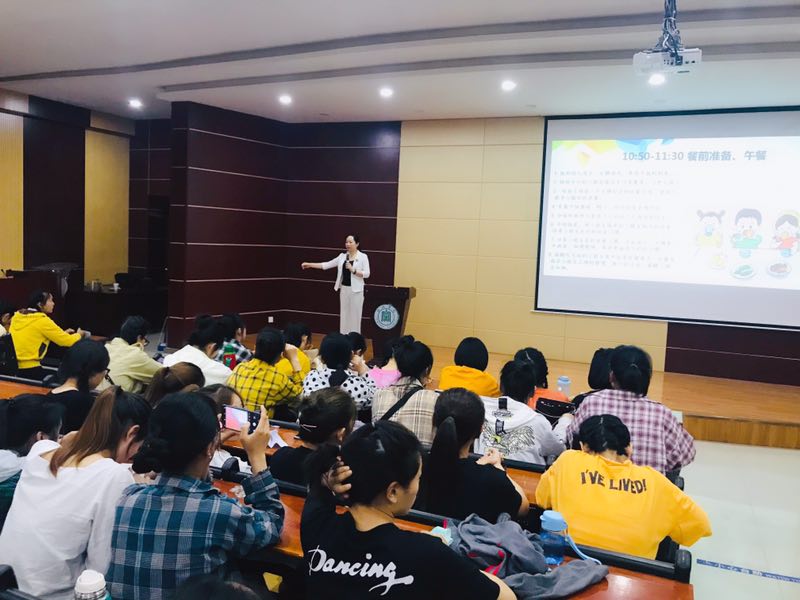 徐园长从幼儿园一日生活的入园接待、晨检、进餐、盥洗、如厕、集体教学活动、区角活动、户外活动、游戏活动、离园等环节,用生动鲜活的案例、幽默风趣的语言向同学们介绍了幼儿日常工作的各项规范及注意事项。随后以,徐园长从学前师范生教育见习的意义、目的、内容、见习成果汇报等方面向学生做了一一阐述,使学生深刻认识到了只有将理论应用于实践,在实践中检验自身的专业素养,才能更深层次理解所学的专业知识,才能更加正确地评价自身的优势和不足,为今后的专业学习提供方向。最后,徐园长结合多年来指导我校实习学生的经验,向即将开展见习的学生提出了许多非常实用的意见。