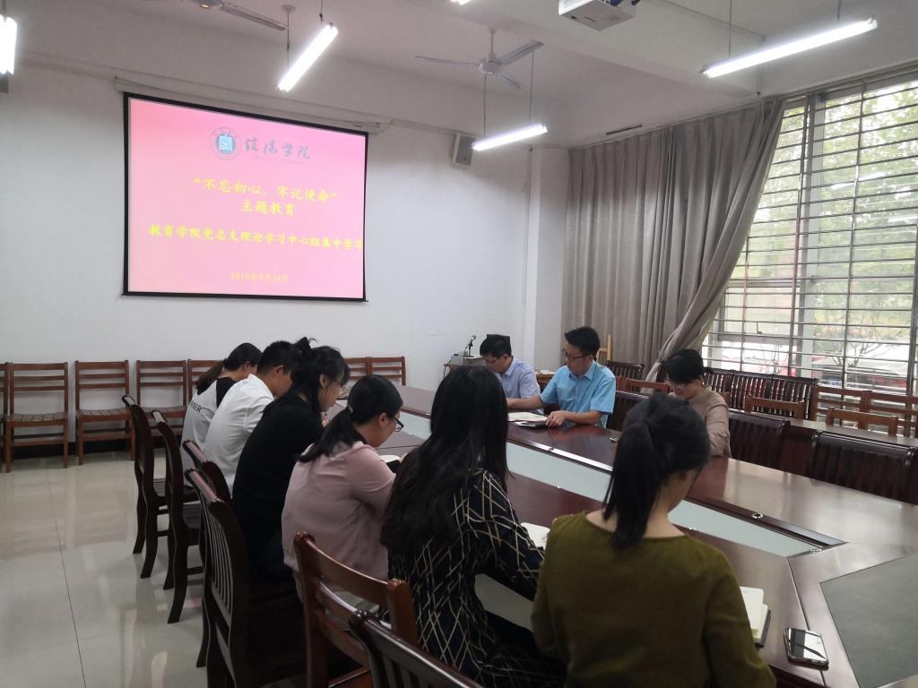 9月24日下午,教育学院党总支在社科楼107会议室召开“不忘初心,牢记使命”主题教育学习活动,党总支书记李赟、各教工和学生党支部书记以及全体辅导员参加学习活动,活动由李赟主持。