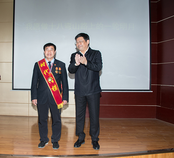 报告会开始前,在热烈的掌声中,郑先明为张玉滚佩戴了“时代楷模”绶带。