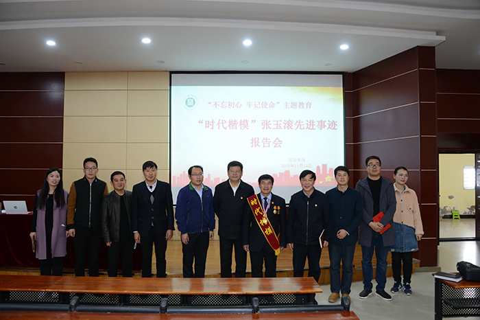 为深入开展“不忘初心、牢记使命”主题教育,学习时代楷模的先进事迹,引导党员干部和广大师生汲取榜样力量,11月14日上午,“时代楷模”张玉滚应邀在我校图书馆102学术报告厅作先进事迹报告。党委书记郑先明,专职副书记施昌海出席报告会。镇平县第一高级中学党总支副书记姜伟,我校有关单位负责人张富庄、张甲楠、李赟、娄琪、余婷婷、郑山峰、陈金强、袁军,各学院学工秘书、辅导员和教育学院师生代表200余人共同聆听了报告会。施昌海主持了报告会。