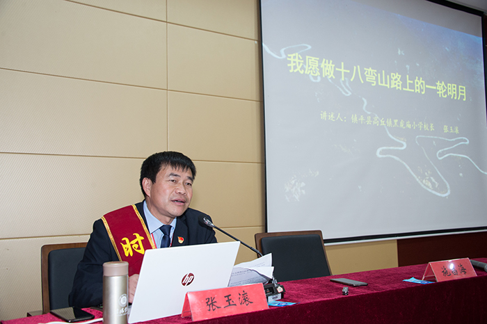 在大家的热切期盼中,张玉滚以《我愿做十八弯山路上的一轮明月》为题,用朴实的语言动情地讲述了自己扎根大山深处坚守乡村一线教师18年的心路历程和生动事例,分享了现场聆听习近平总书记在五四运动100周年大会上的重要讲话和参加国庆阅兵的喜悦心情。他为了山区的教育事业,用扁担挑书、在食堂做饭;为保护孩子们的新书不被雨水淋湿,在寒冷黑暗的山洞里度过过通宵;冒着生命危险从危房中将村里的爷孙俩救出;为了更好地照顾孩子们,练就了“拿起教鞭能上课,掂起勺子能做饭,捏起针线能缝补,打开药箱能治病”一身本领;学校教师不足,把自己磨练成为一名“全能老师”,千方百计地上好每一节课。一桩桩爱护学生、精心教学、默默坚守的感人事迹,饱含深情,令人动容。他用自己的身心奉献山村教育事业,用一根根扁担挑起孩子们走出大山的希望,是新时代“四有”好教师的典范,是共产党员“不忘初心、牢记使命”的标杆。他表示要继续做一个挑山工,矢志不移;做一名躬耕者,执着坚守;做一个守望人,快乐前行;做一名筑梦匠,薪火相传。