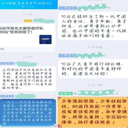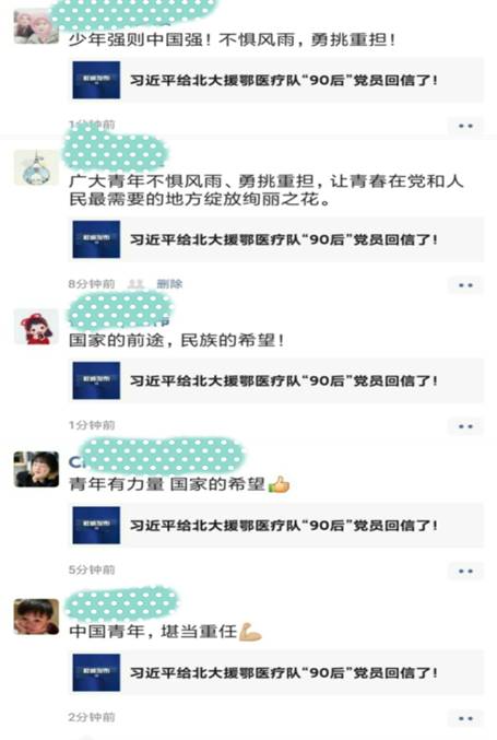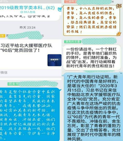 在抗击新冠肺炎疫情的关键时刻,3月15日,习近平总书记给北京大学援鄂医疗队全体“90后”党员回信,向他们及奋战在一线的广大疫情防控人员致以亲切问候,并寄语广大青年不惧风雨、勇挑重担,“让青春在党和人民最需要的地方绽放绚丽之花”。3月27日,教育学院组织广大团员青年以线上学习的方式,号召各团支部要以学习回信为契机,深刻领悟“青年是闯关夺隘的先锋力量”的意义。