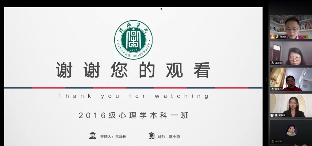2016级心理学专业本科班(53名学生)分成两个答辩小组,其中第一组组长为许远理教授,成员为杨立昊、段海丹,第二组组长为陈录生教授,成员为陈小静、崔小蕊分别于2020年5月10日上午和下午两个时间段进行了毕业论文线上答辩。
