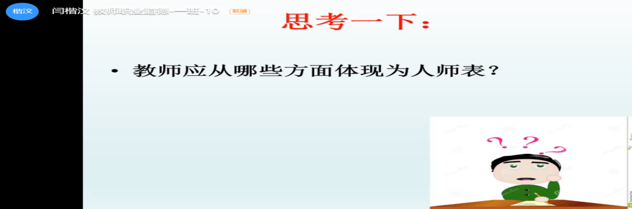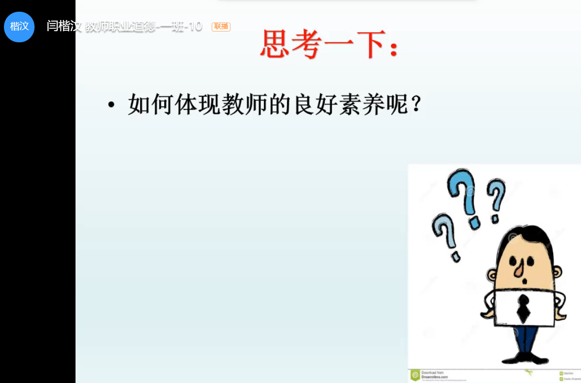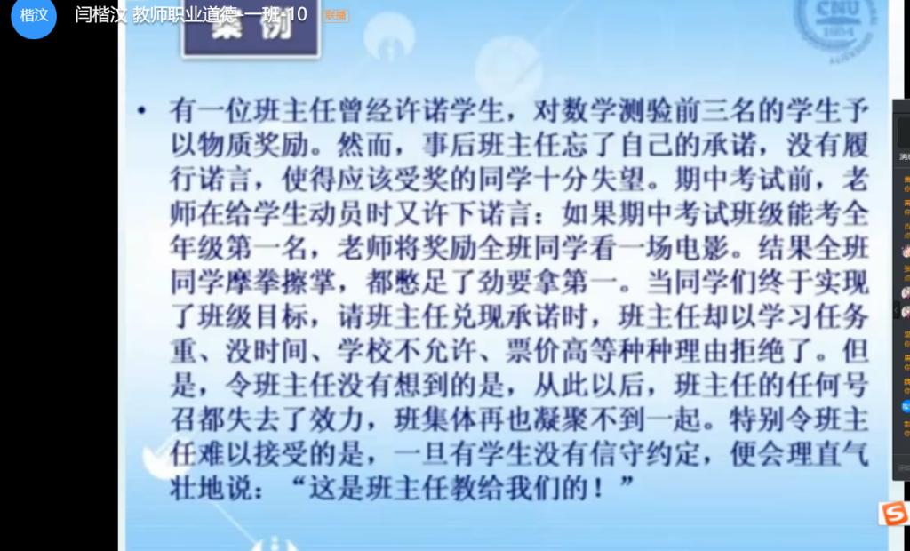 教师职业道德与专业发展:本周所讲内容为为人师表:教师职业的内在要求。本次课偏向更贴切学生未来职业选择,将课程内容与学生的自身经历相结合,(下载了谭千秋、殷雪梅等视频)帮助他们来理解相关知识点。