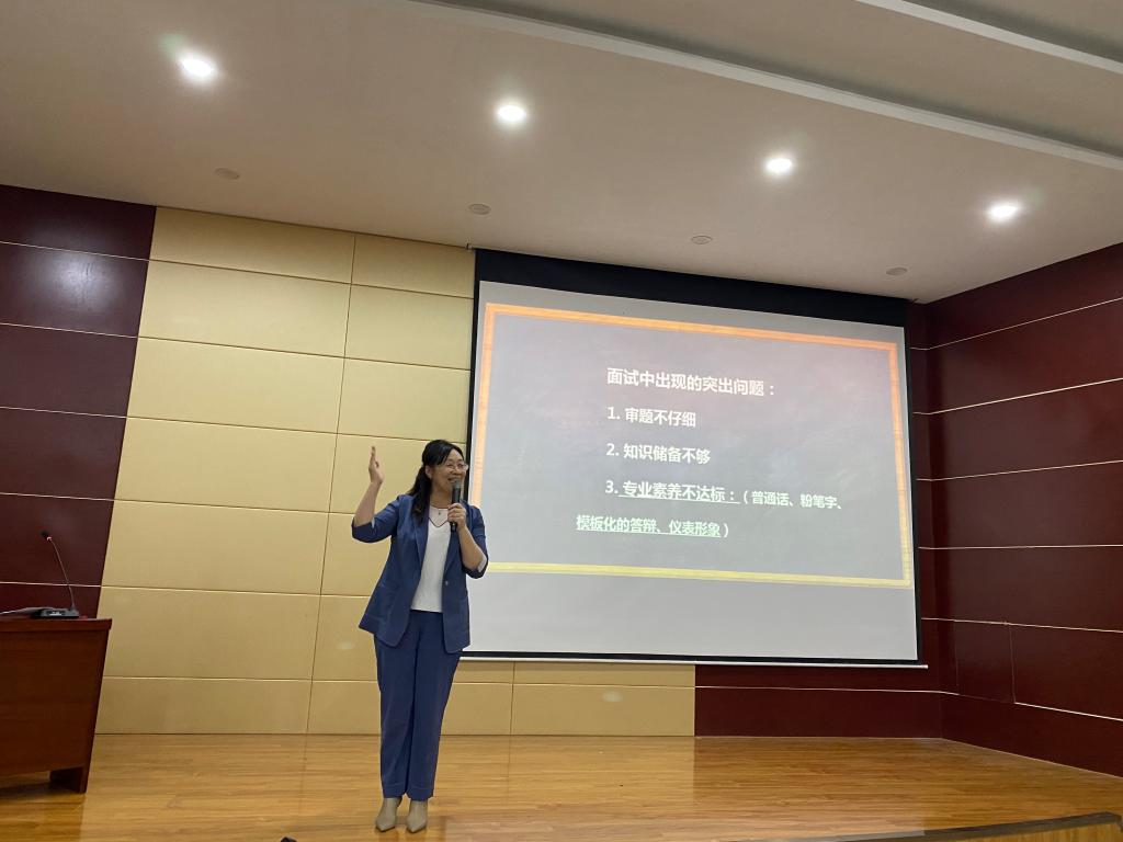 聘任仪式结束后,王秀娟校长从师范生教师资格证的面试环节展开,结合案例,深入浅出地向同学们传授经验,提出一些普遍存在的问题。如知识储备不足、专业素养不达标、答辩环节模板化等问题,同时也站在考官的角度,给出了相应的建议。其次,她又通过图片、视频等方式为大家展示了十三小的发展成绩与魅力风采,尤其是十三小丰富多彩的主题活动使在场的师生颇感震撼,更重要的是让我校师范生了解了当前小学教育发展中最新的理念与动态。最后,王校长亲自示范了一次精彩的说课。其生动流畅的语言,为我们完整地呈现了一场小学语文课堂的说课过程。她对教材与学生的精准分析、教学目标的准确定位、教学技能的恰当应用以及精彩的解说过程,令在场师生叹服。