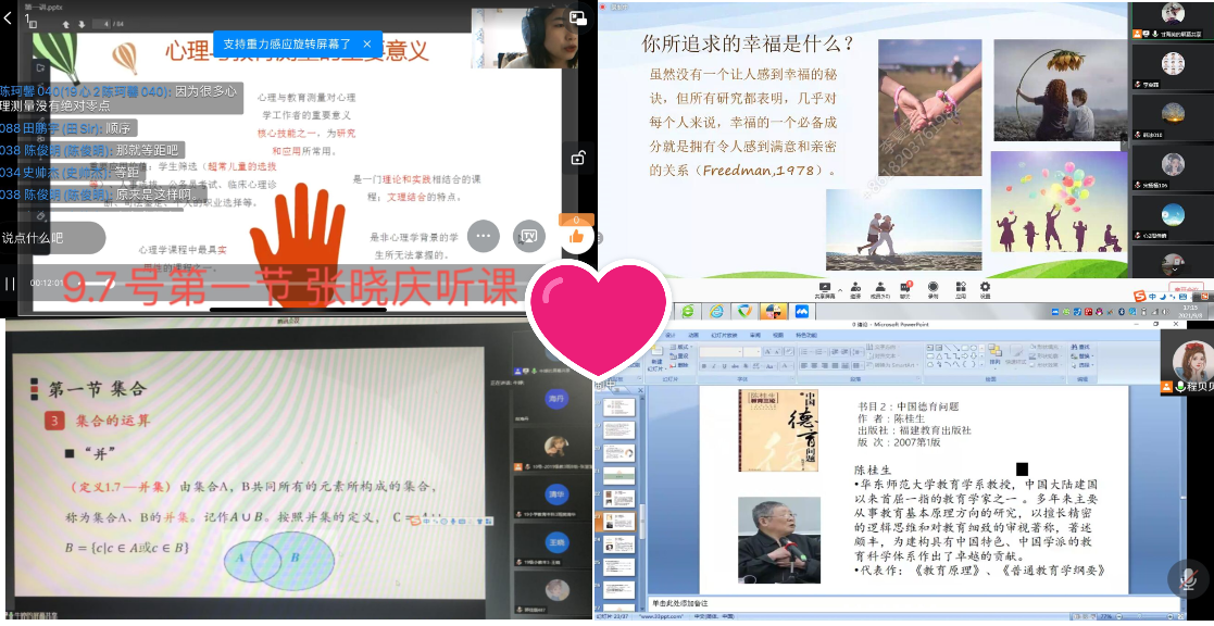教学秘书段海丹就线上督导听课情况进行了反馈和总结,9月6日开始线上授课以来,教育学院建立了线上教学质量三级监督机制。首先,由班子成员对接各个教研室,以对教师的线上授课情况进行随机听课;其次,由学院督导老师对线上授课情况进行随机听课;另外,学院还以教研室为单位,以教研室主任和副主任为组长,建立教研室内部老师之间的互相听评课制度。通过三级督导听课机制,学院在第一周对全院有线上授课的老师,实现了网上督导听课、巡课全覆盖。通过听课巡课结果的汇总和归纳,发现了很多老师有较成熟的线上授课方式,他们会想办法在授课方法和互动方式上创新、在作业布置和讨论方式等方面灵活处理。听课中也发现有个别新入职教师在课堂授课中互动较少、声音较小、缺乏线上板书和提问的技巧等问题。段海丹强调,督导听课,一定要以导为主,以督为辅,要通过督导听课,提高老师们的教学质量,所以老师们在后续的教学中一定要通过听评课互相学习和改进。