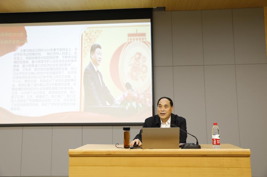 王北生围绕三年抗疫的非凡实践、三年抗疫的成功经验、让青春在新时代绽放绚丽之花三个方面,为师生们讲授了一堂生动的思政课。他结合信阳学院优秀学子成长成才的故事,勉励广大青年学生奋发图强,学好本领。