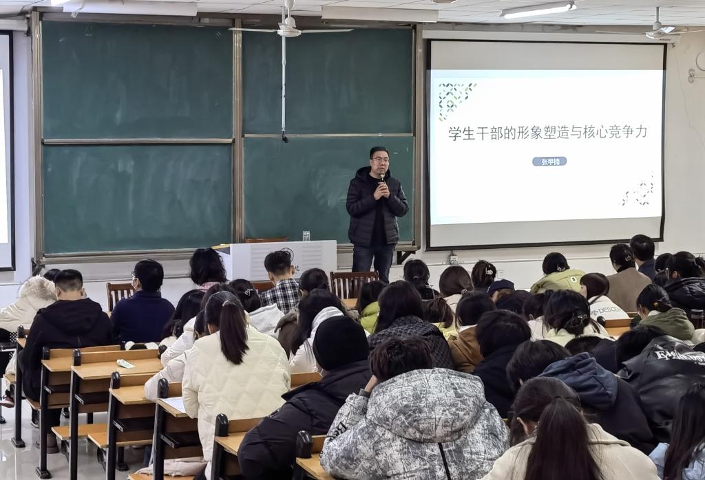 张甲楠以“学生干部的形象塑造与核心竞争力”为主题作宣讲,首先对“学生干部”四字进行拆开讲解,强调学生干部要着力提升良好形象和核心竞争力,要善于自我批评,合理分析并解决自身存在的问题,主动汇报工作,立足创新,增强干部之间的凝聚力和向心力。最后,张甲楠书记对我院学生干部的辛勤付出提出了表扬,并对今后的工作提出了殷切的期望。