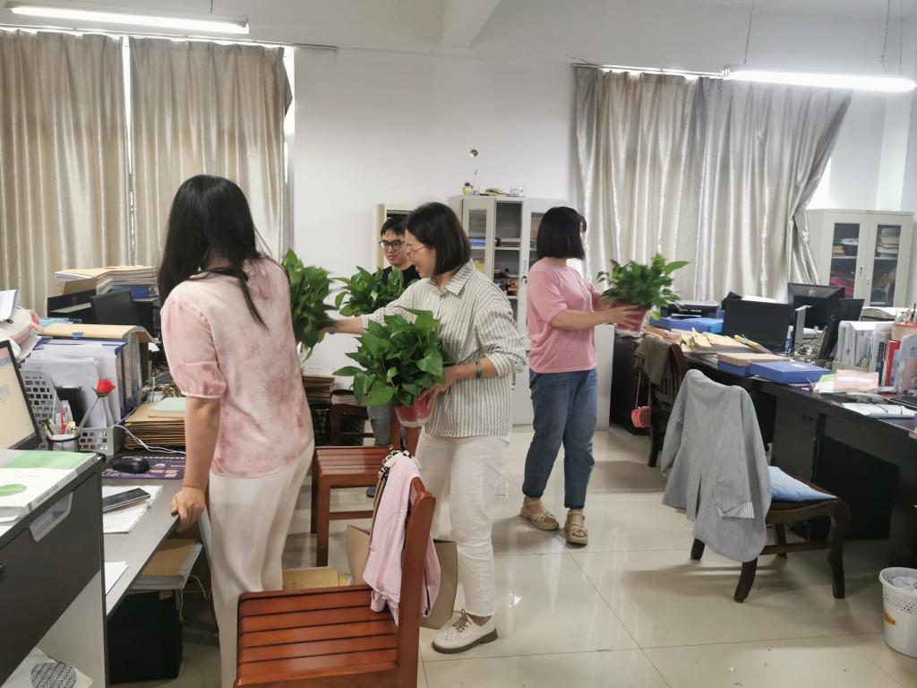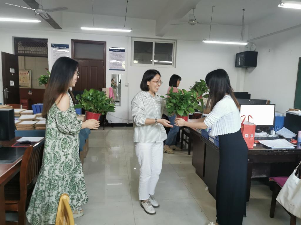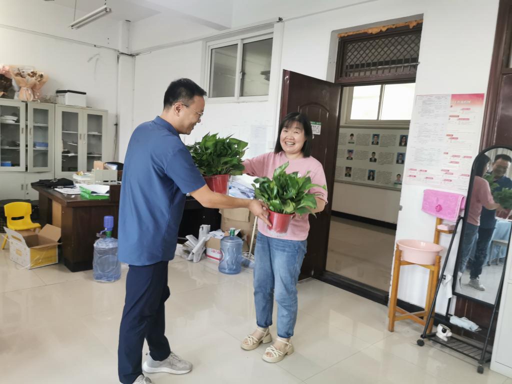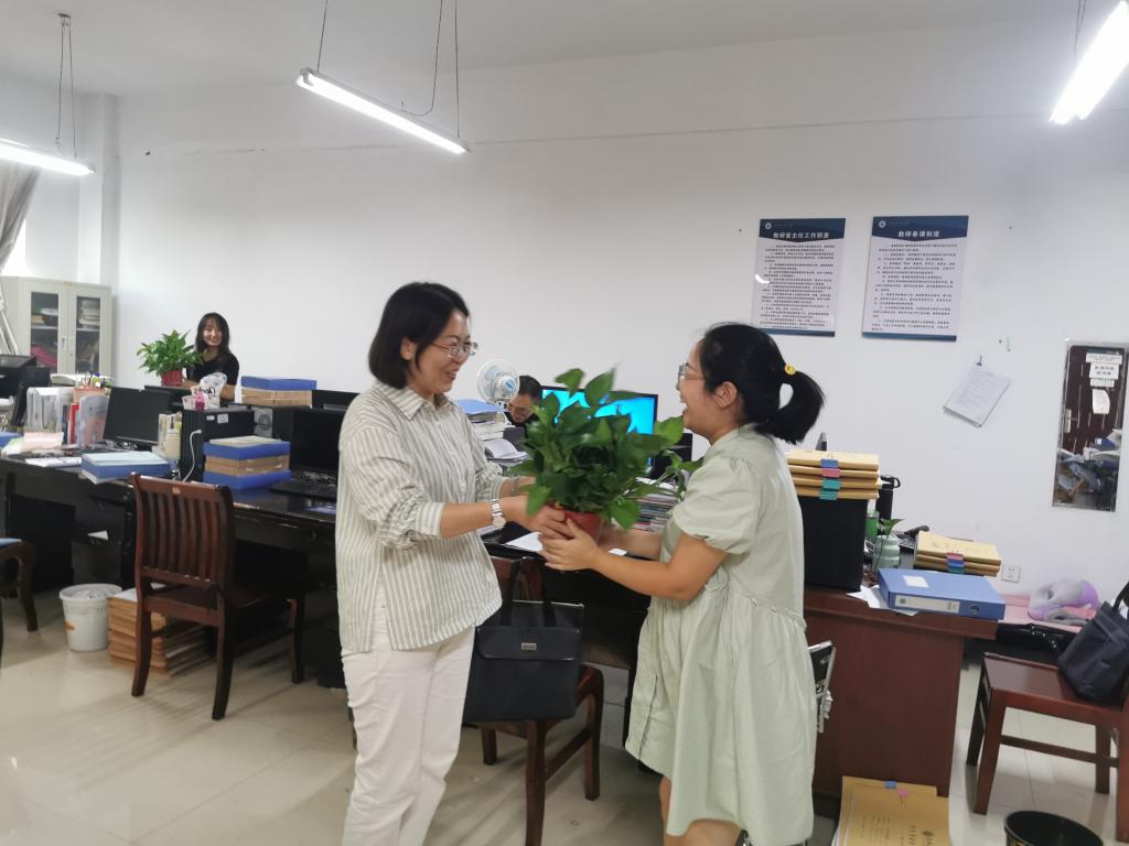 金秋丹桂香,关怀润师心,在第40个教师节来临之际,教育学院举行喜迎教师节送绿植活动,党总支书记刘颖方、副院长段海丹带领班子成员为各教研室送上盈盈绿意,表达对老师们的慰问和关怀。