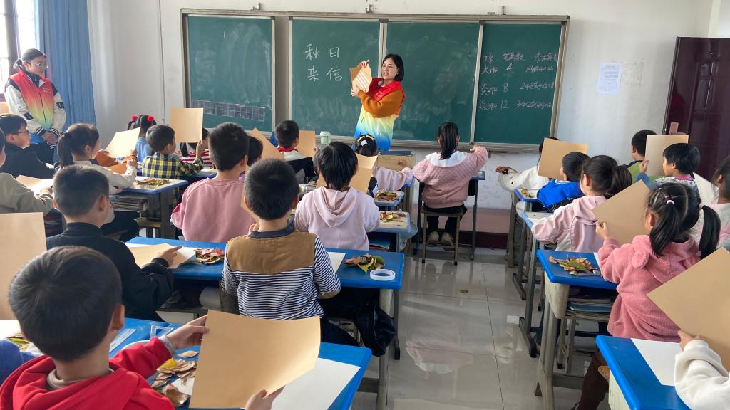随后,孩子们开始利用早已准备好的牛皮纸、卡纸、胶带以及各种形状、颜色的落叶和枯草开始制作与装饰属于自己的“信封”。他们小心翼翼地用胶水将落叶粘贴在信封上,有的拼成了大树的轮廓,有的则点缀成秋日的晚霞。枯草则被巧妙地编织成小动物的形状,或是作为边框装饰,经过师生的共同努力,一个个独具匠心的牛皮纸信封在孩子们的手中诞生。这些信封不仅承载着他们对秋天的美好记忆,更成为了他们心中对美的追求与向往的象征。