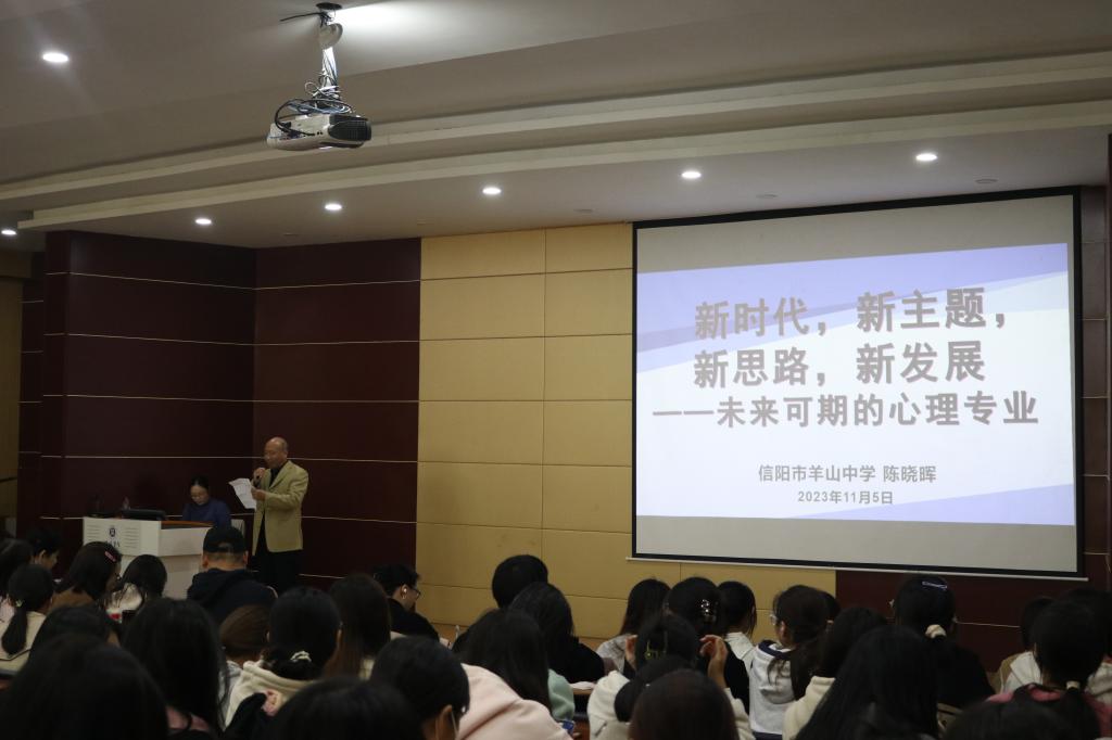 本次会议分为两部分,首先由校外行业专家,羊山中学副校长,中小学正高级教师陈晓晖作了题为“新时代,新主题,新思路,新发展——未来可期的心理学专业”的讲座,讲座从心理学发展现状、心理学就业前景、心理学就业方向、心理学专业学生如何做好专业规划等方面进行了深入浅出的讲解。