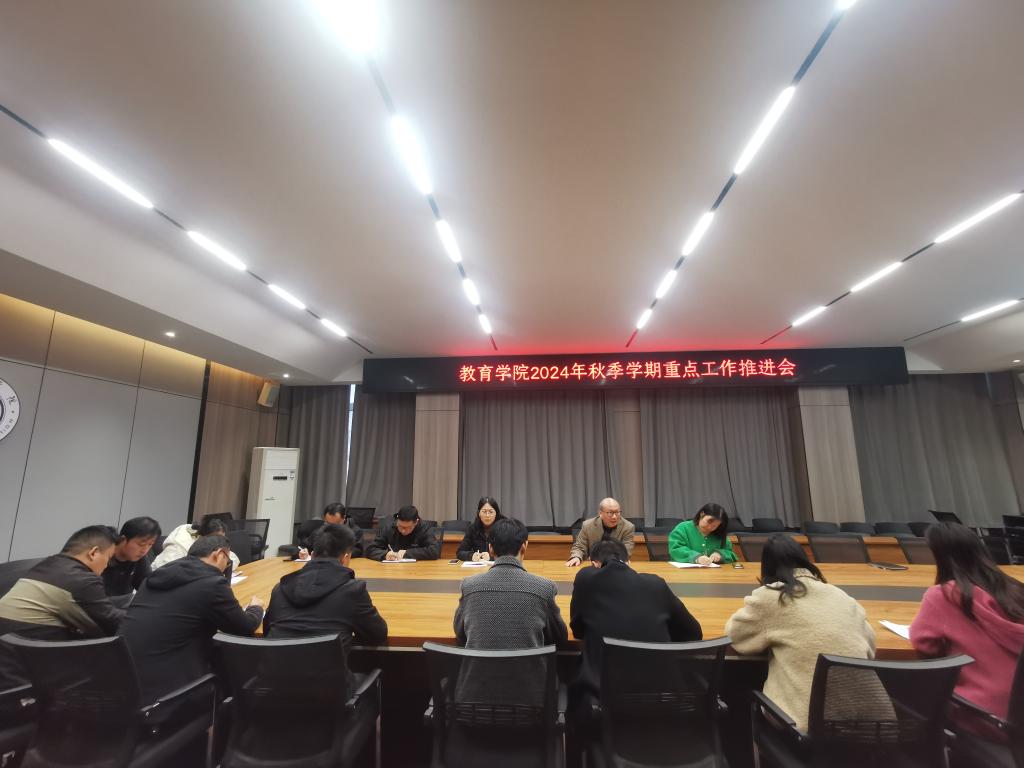 11月18日下午,教育学院在社科楼109会议室召开了2024年秋季学期重点工作推进会,名誉院长、党总支书记刘颖方、副院长段海丹及班子成员、教研室主任和相关辅导员老师参加了此次会议,会议由名誉院长主持。