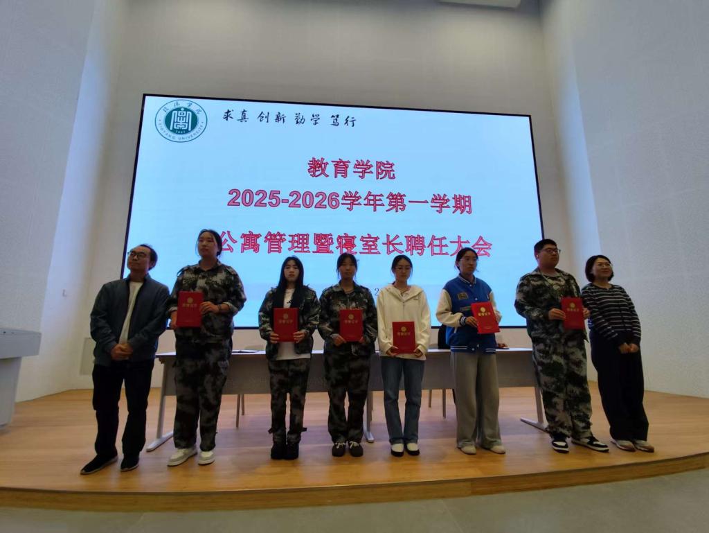 随后,会议进入庄严的聘任仪式环节。在热烈的掌声中,教育学院党总支书记刘颖方和学工干事胡超为本次新聘任的寝室长和楼层长代表逐一颁发了聘书。这份聘书不仅代表着荣誉,更承载着学院对各位学生骨干的信任与殷切期望。