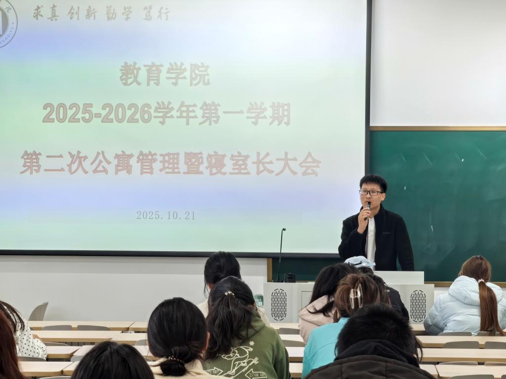 为筑牢宿舍安全防线,规范公寓日常管理,10月21日,教育学院召开2025-2026学年第一学期第二次公寓管理暨寝室长大会,150多位寝室长参会,樊雪冰老师主持会议并作重点部署。