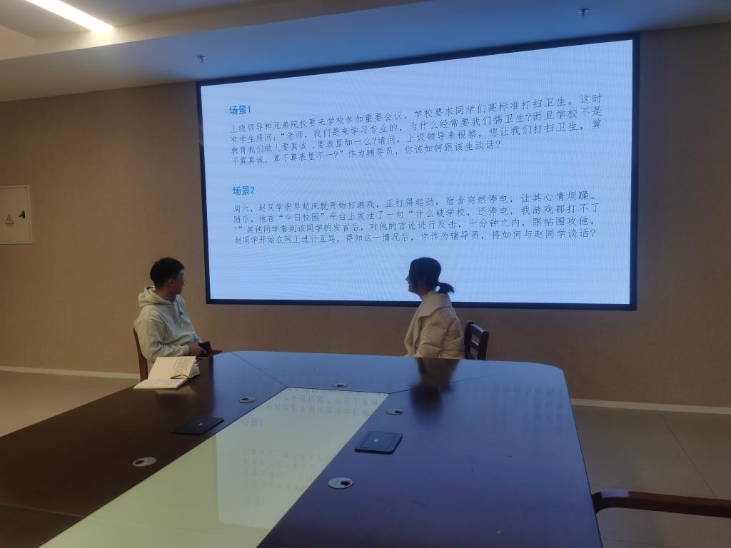 在前期学校组织的辅导员素质能力大赛中,教育学院辅导员付珺先后通过笔试和案例研讨环节选拔,成功进入决赛谈心谈话环节。为帮助参赛辅导员进一步深化对谈心谈话环节考察重点的理解,全面提升分析问题和解决实际问题的能力,学院高度重视并精心组织了此次专题培训。