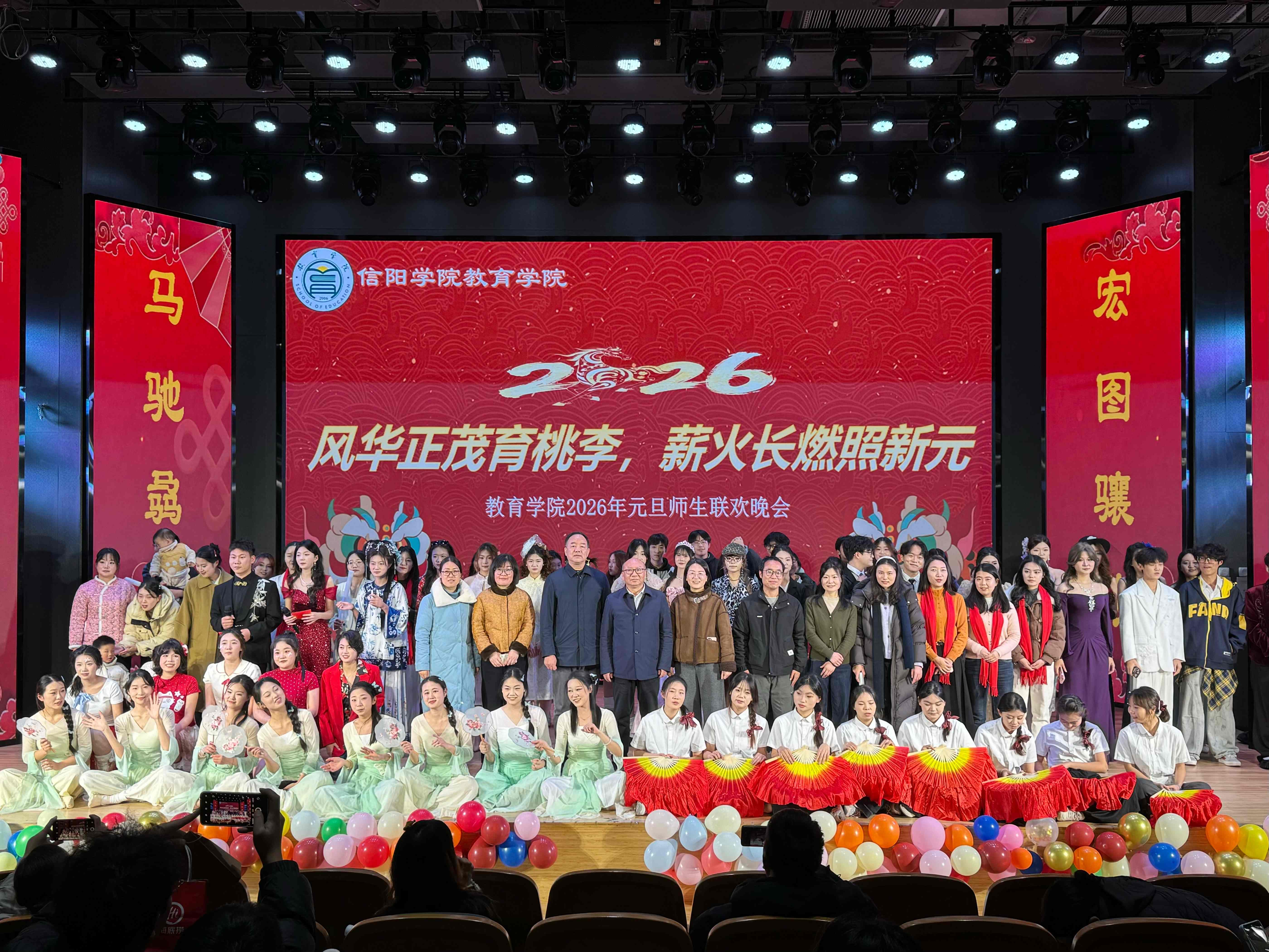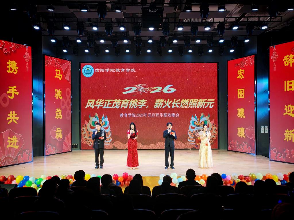 时序轮替,辞旧迎新。为喜迎2026年的到来,展现信阳学院教育学院学子昂扬向上的精神风貌,丰富校园文化生活,12月23日晚,教育学院在南湖校区教一楼113演播厅隆重举行了以“风华正茂育桃李,薪火长燃照新元”为主题的2026年元旦师生联欢会,同时教三楼005报告厅作为晚会分会场同步精彩直播。学院名誉院长汪基德、党总支书记刘颖方、副院长段海丹和各位领导老师与全院师生欢聚一堂,共庆元旦,喜迎新年。