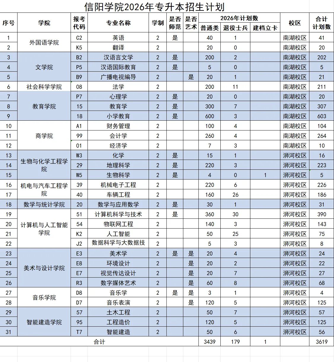 信阳学院2026年专升本招生计划