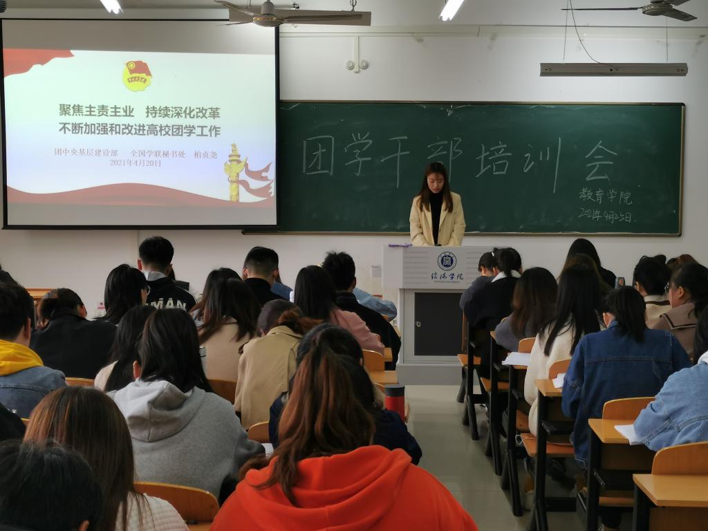 为了聚焦主责主业,持续深化改革,不断加强和改进高校团学工作,教育学院于2021年4月25日下午在社科楼315举办了高校团学干部培训班,深入贯彻学习高校团学改革工作,在主讲人张甲楠书记的讲解下,班级团支书对此有了深刻感悟。