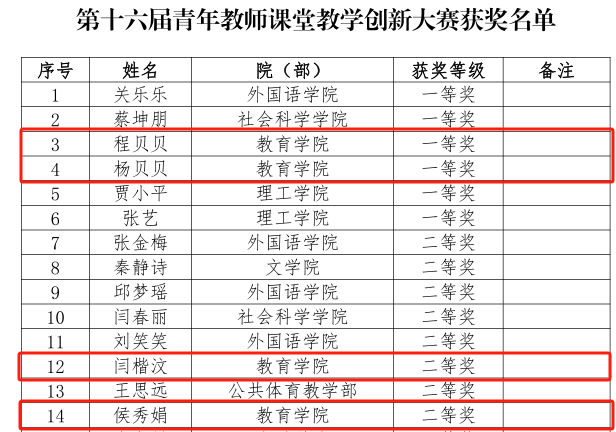 近日,信阳学院第十六届青年教师课堂教学创新大赛落下帷幕,在教师教学发展中心公布的获奖名单中,我院参赛的4位青年教师程贝贝和杨贝贝荣获一等奖,闫楷汶和侯秀娟荣获二等奖。