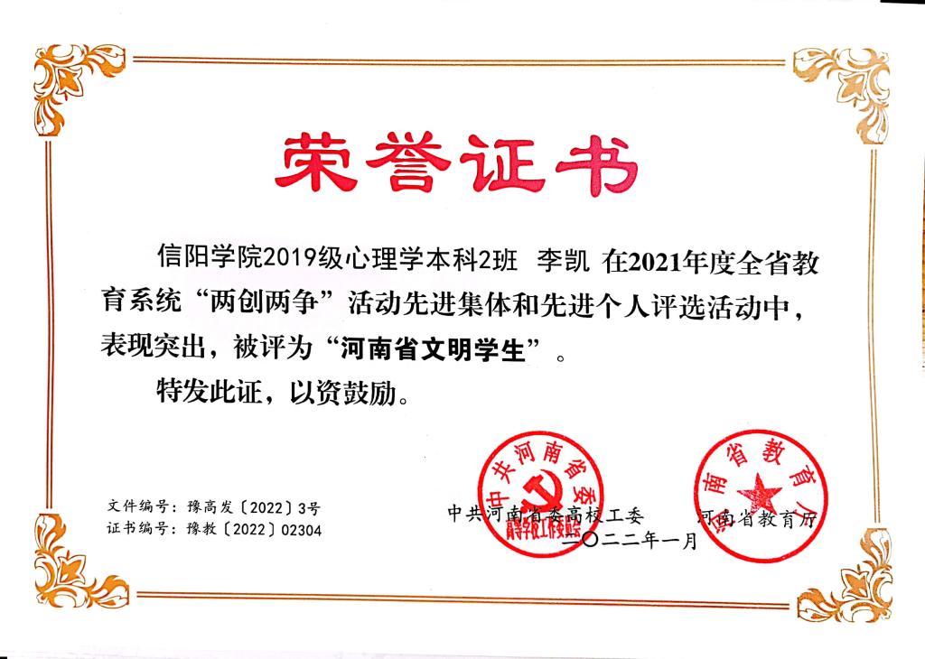 李铭浩、黄永宾、房燕等同学在河南省师范教育专业教学技能比赛中连年荣获一等奖;李凯荣获“河南省文明学生”荣誉称号;薛玉洁荣获校园排舞大课间网络展示大赛一等奖;杨飒、蔚元雪设计的心理团辅教具箱荣获河南省中小学教学科研成果奖一等奖;在第五届大学生创新创业大赛信阳总决赛中,我院学生荣获创新组三等奖。在2018年第三届全国学生社团影响力展示活动中,俏皮影协会荣获“全国学生最具影响力传统文化社团”荣誉称号;点津教育学社荣获“全国学生最具影响力理论研究社团”荣誉称号。贾晓雨、王子豪等多名同学参与教师科研和学生科研项目。