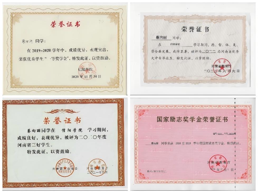 在信阳学院小学教育专业学习的四年里,蔡向丽同学展现了出色的学习能力和严谨的治学态度。她系统掌握了教育学、心理学等专业理论知识,成绩优异,为未来的教师生涯打下了坚实的理论基础。她在校先后获得了国家励志奖学金、校一等奖学金、河南省三好学生、河南省优秀毕业生等荣誉,并通过了大学四六级考试。2022年7月,她以平均绩点4.04的优异成绩顺利完成本科学业,并成功通过选拔激烈的河南省特岗教师考试,这既是对其大学四年所学所获的一次全面检验,也是其专业能力过硬的有力证明。